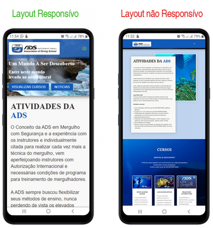 Com esse numero chegamos a conclusão que todo site tem obrigação de ser responsívo, pois um site que não tem esse recurso estará limitado à receber usuários que acessam apenas via PC, tendo a visualização muito comprometida através de outros dispositivos, e dessa forma deixar de atingir um numero muito grande de pessoas. Abaixo podemos ver o mesmo site sendo visualizado via Smartphone, o primeiro conta com um layout responsívo e o segundo não.
